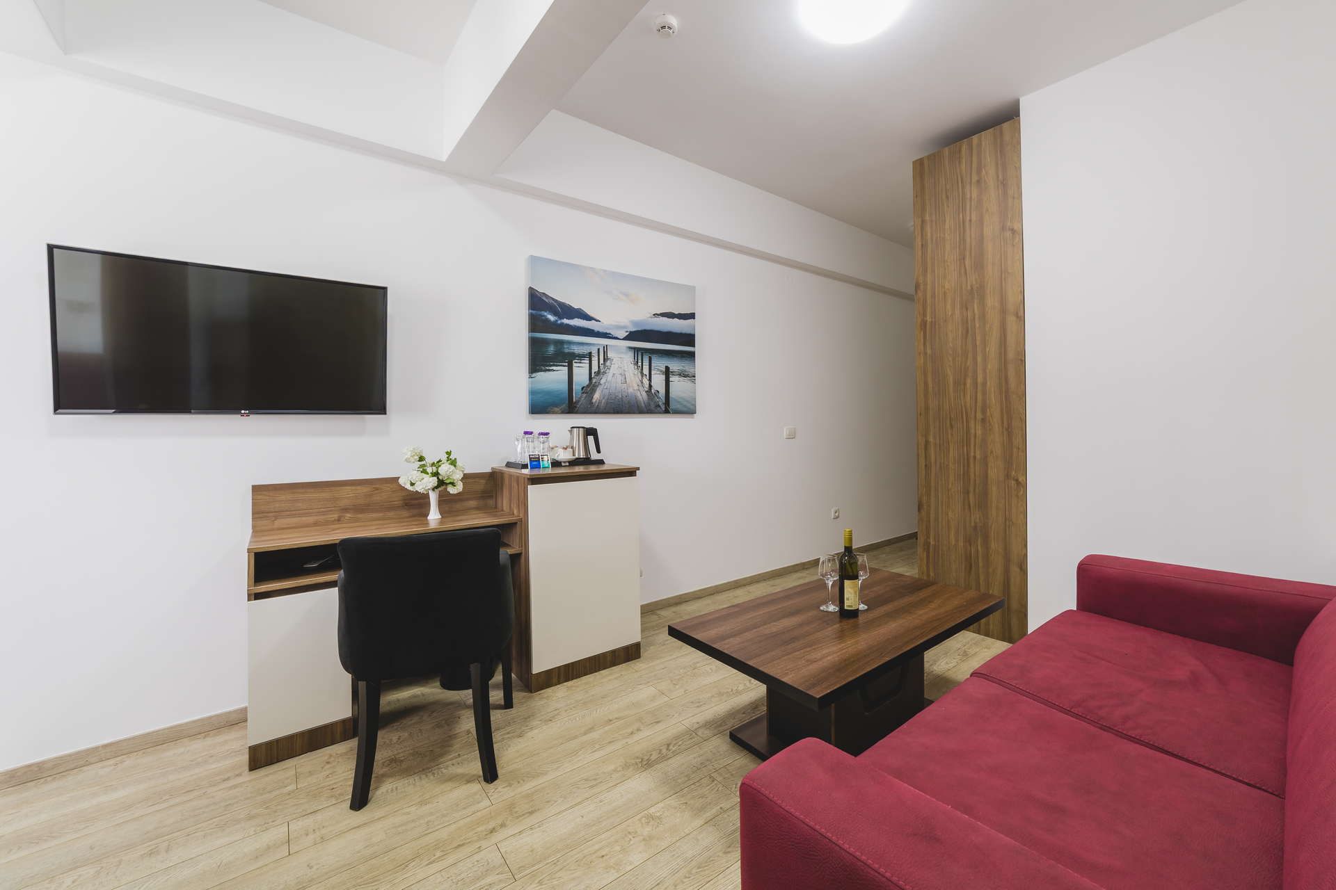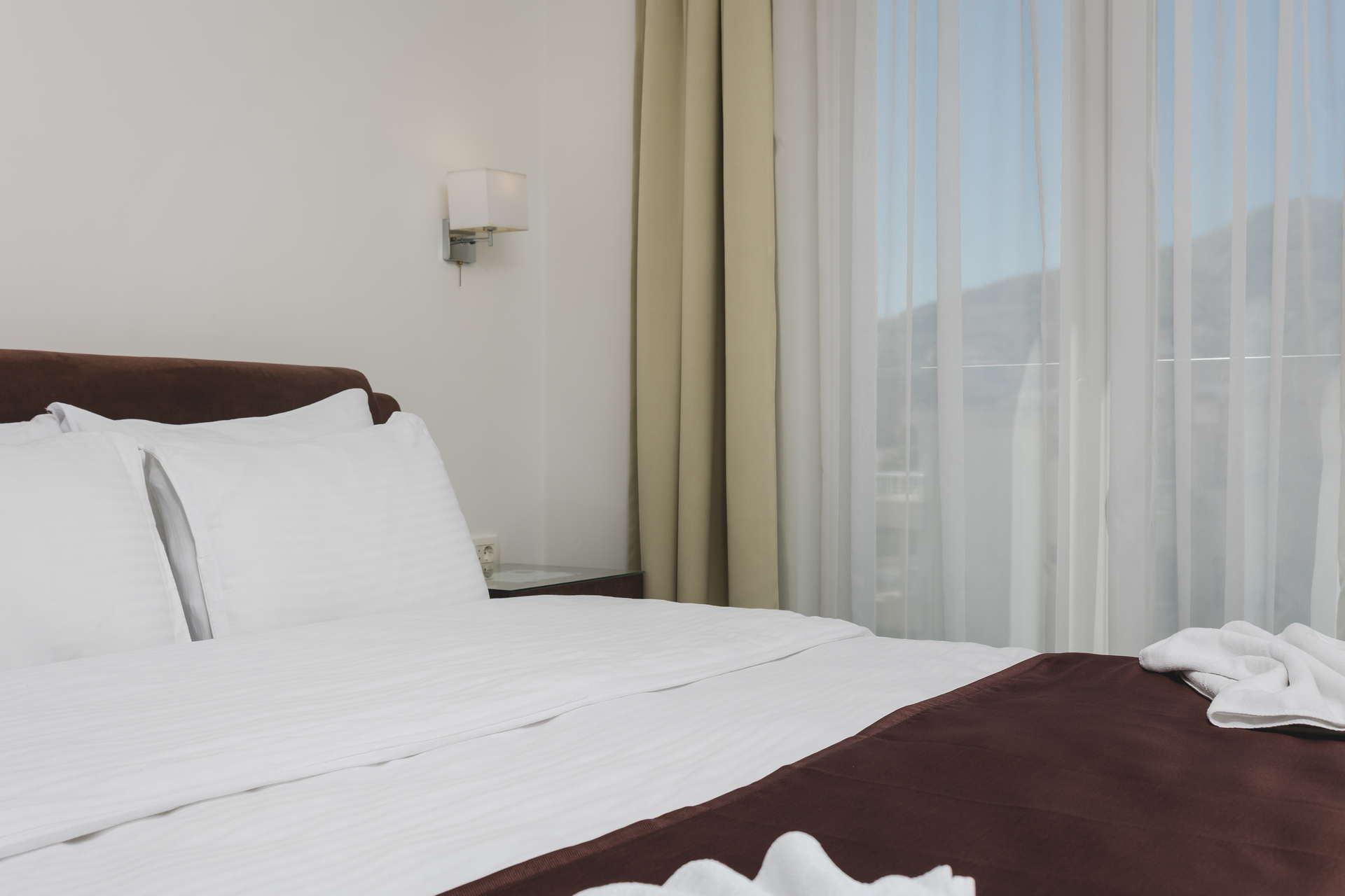 Apartmani imaju glavnu spavaću sobu opremljenu bračnim krevetom 180/200cm i svijetlu prostranu dnevnu sobu u kojoj je diskretno odvojen prostor sa bračnim krevetom 180/200cm.