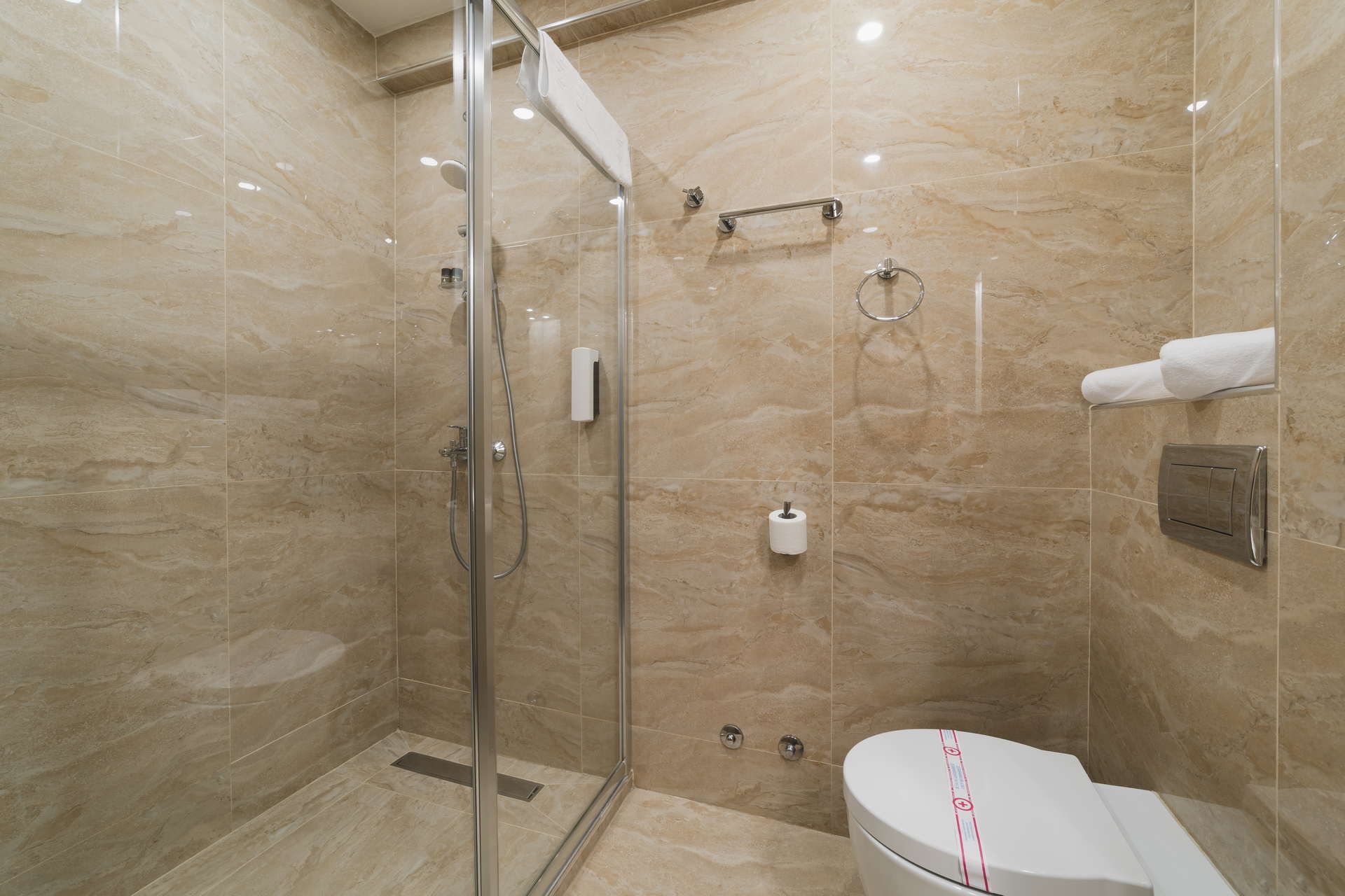 Bathroom with a walk-in shower, hair dryer and high-quality hotel cosmetics.